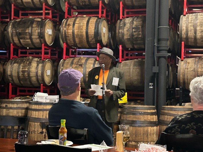 Volunteer recognition kicked off the formal program. Events managers Christian Helem and Brittany Gillespie handed out volunteer awards to two members who did a lot of heavy lifting at ATA’s massive Bike the Drive event. Campaign organizer W. Robert Schultz III took the mic to present an award for advocacy. Schultz, a self-described “public transportation nerd” (“Ask me about the history of trains and we’ll spend a few hours together” – where was my father for this?), serves as advocacy committee co-chair of the Transportation Equity Network, a coalition pushing for racial and mobility justice at local, state and national levels. The advocacy award went to TEN co-chair Jose Acosta of the Little Village Environmental Justice Organization.