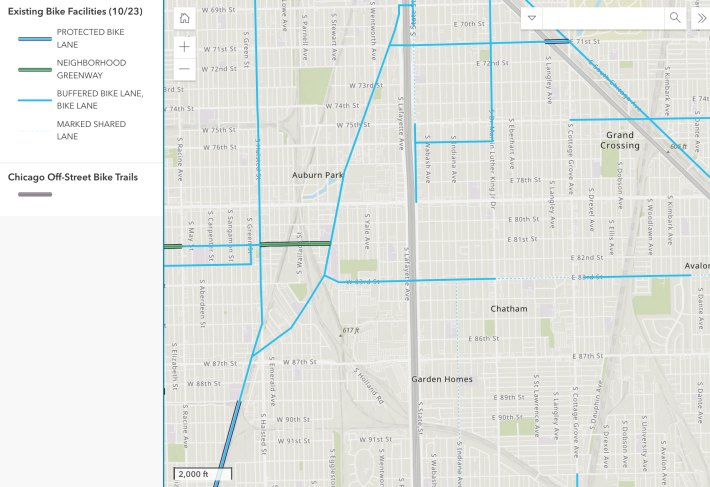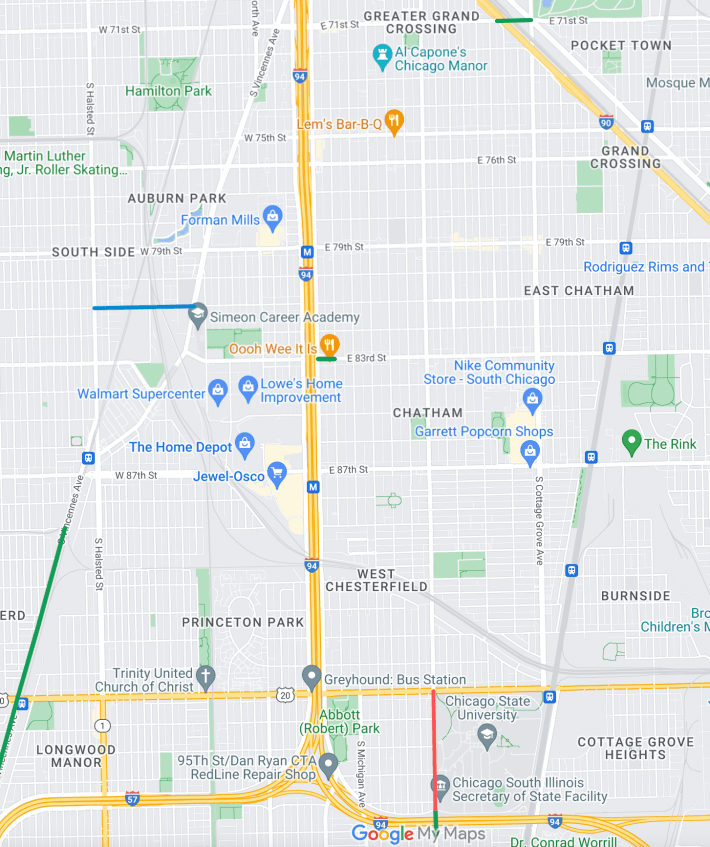 Below are the segments I checked out on the Mid-South Side today. Green = protected bike lanes, blue = Neighborhood Greenways, and red = non-protected bike lanes on main streets. I got to ride all of these except the red and green line on King Drive south of 95th, which was listed on CDOT’s old (now defunct) bikeway project list as “underway,” but didn’t actually have any bikeways yet when I dropped by.