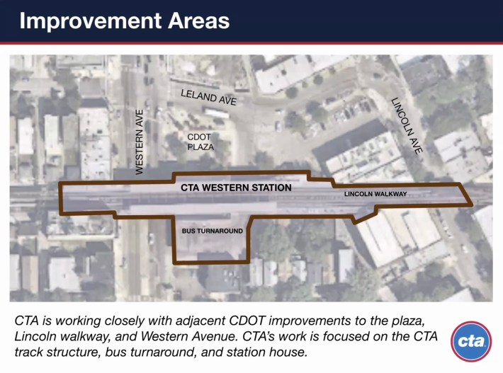 “The improvement areas you can see on the map and we see Western on the left and Leland to the north,” Mascheri said. “While we’re looking to do some work within the station limits, we’re also working closely with the Chicago Department of Transportation kind of hand in glove with some additional work that they’re looking to do with the walkway over Western Avenue. Our work is focused predominantly with the CTA track structure, the bus turnaround and with the station.”