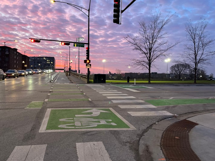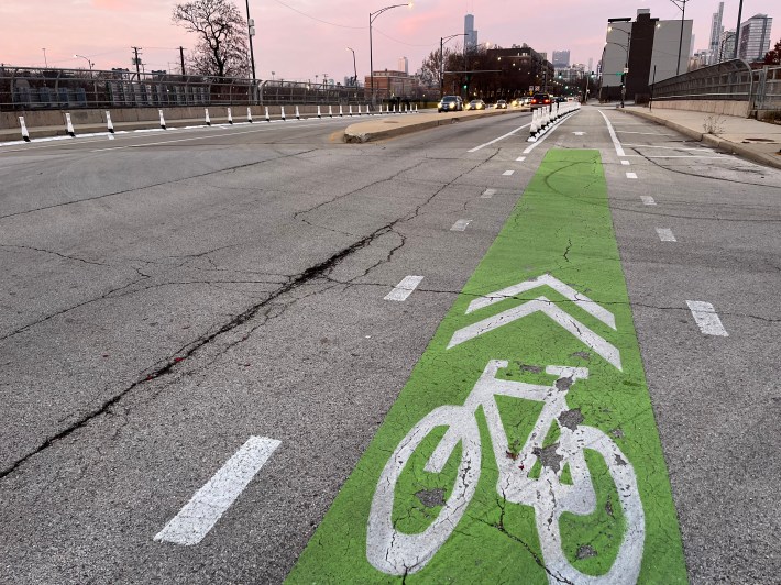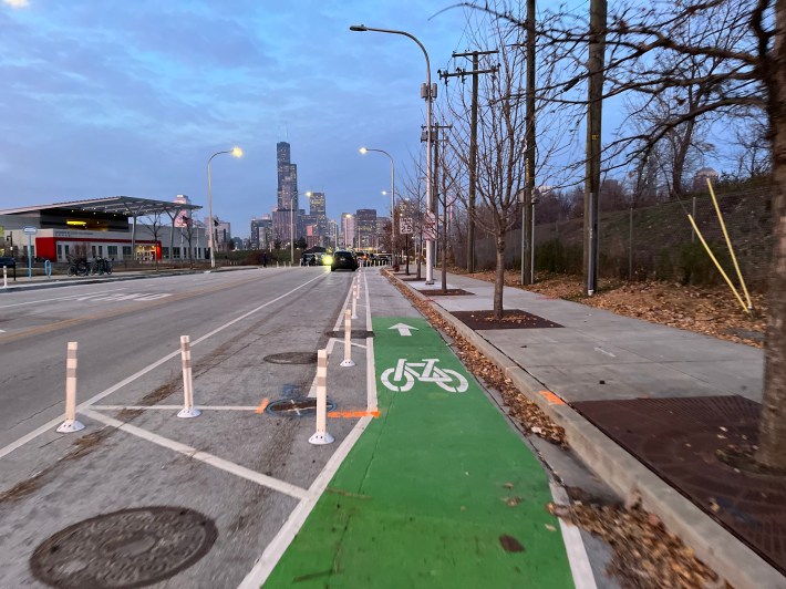 But don’t get too excited. A raised bike lane has already been built on the Wells-Wentworth Connector, a new road located west of Clark Street linking the South Loop and Chinatown that’s part of The 78 megadevelopment. But there’s still fencing a couple blocks north of 18th to stop you from riding on it.