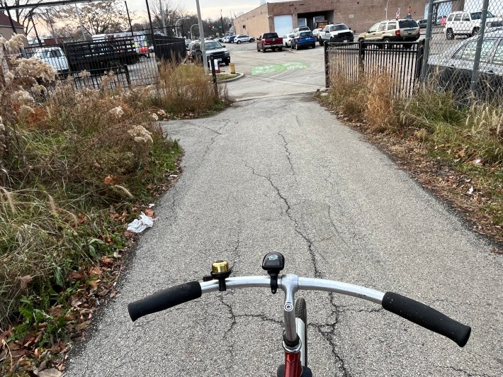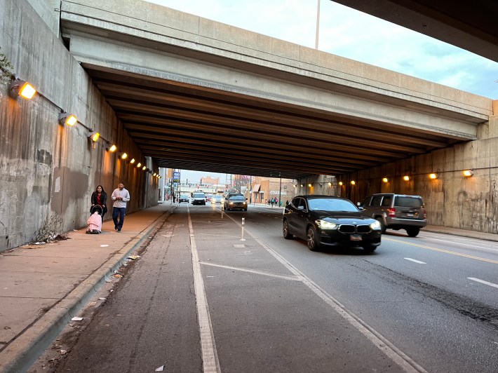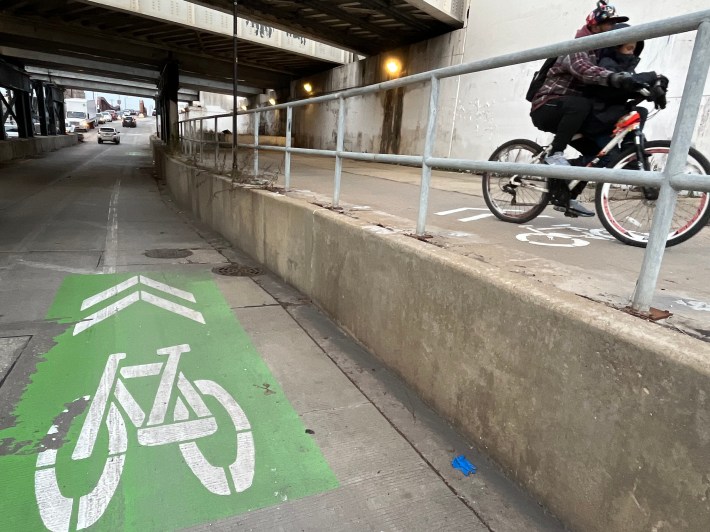 There’s not much to write home about here. It’s just a short stretch between the Stevenson Expressway (I-55) and the river that doesn’t offer much in the way of protection yet. There are just some flimsy plastic posts along the curbside lanes in the underpass below the highway, and near the bridge.