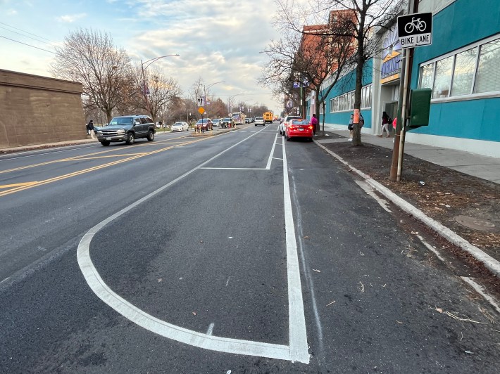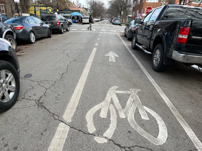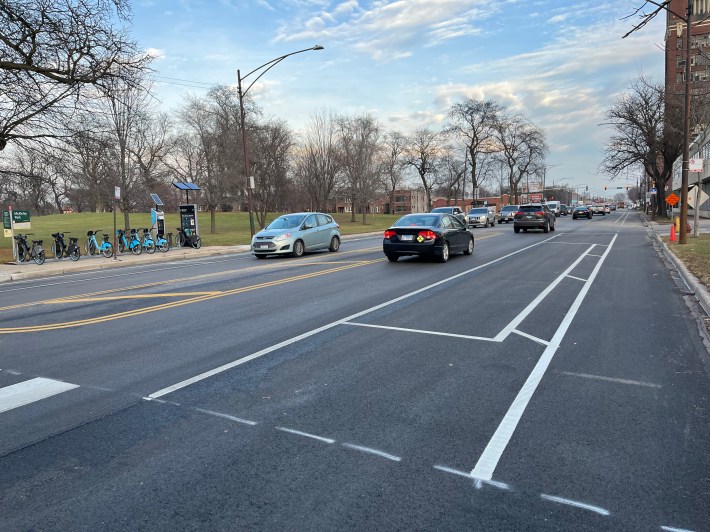 These lanes are partially finished, and only consist of paint right now. As a result, many drivers are currently parking in the curbside bike lanes, rather than the “floating” parking lanes. However, as we’ve seen on the new Clark Street PBL in Uptown/Lakeview, this behavior will likely change after concrete protection is installed.