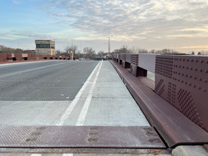 However, as is the case in almost all Chicago curb-protected bike lanes, there are gaps in the protection. That’s sometimes caused by the desire to preserve curbside car parking, but in this case the installation may not be complete yet. There’s also no protection for bicycle riders from drivers on the metal Chicago River bridge grate here, although there is decking for the bike lane to reduce slip-and-fall hazards.