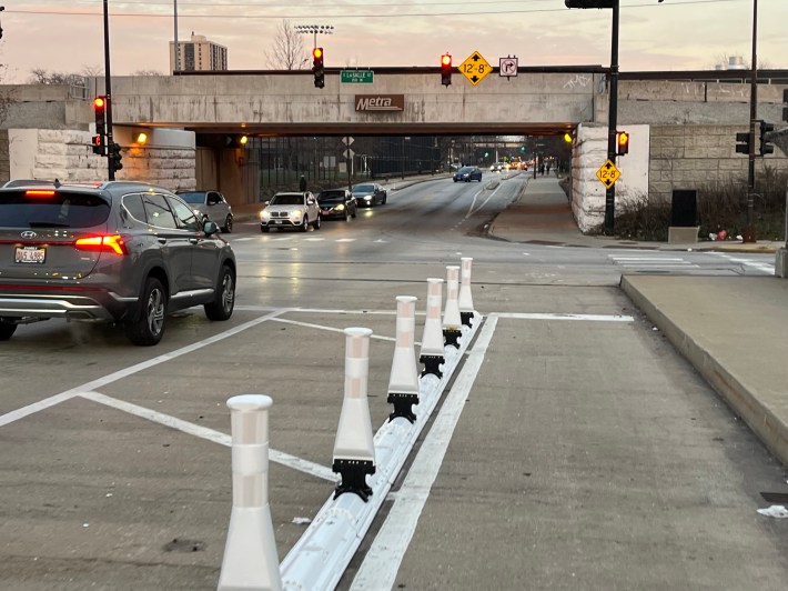 The plastic curbs with flexible posts on this stretch basically only cover the stretch of 31st that passes over the Dan Ryan Expressway. CDOT says plastic is the only option for PBLs on some Chicago bridges. But on the bright side, the curbs extend the existing concrete-protected lanes on 31st by another block or so.