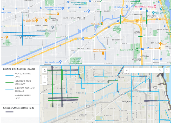 Streetsblog Chicago’s Bike Lane Week – in which I’m doing ‘L’ train + bicycle trips to explore 2023 Chicago Department of Transportation bikeway installations that I haven’t viewed in person before – keeps rolling along. See SBC’s map of this year’s completed and underway projects below.