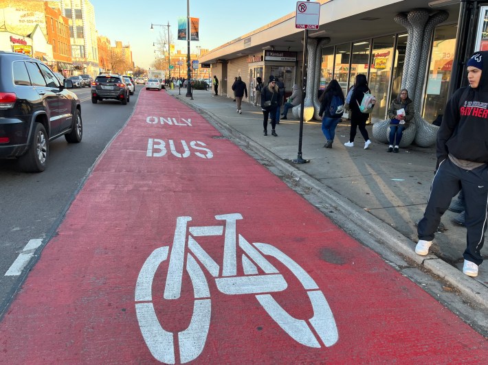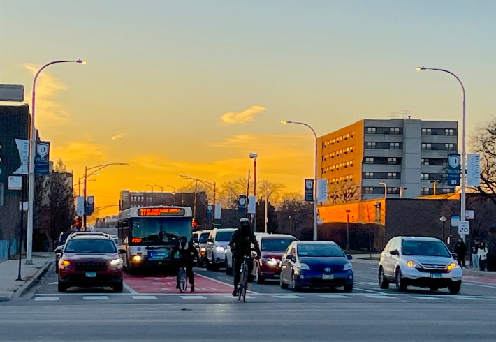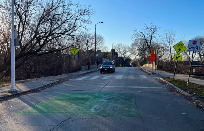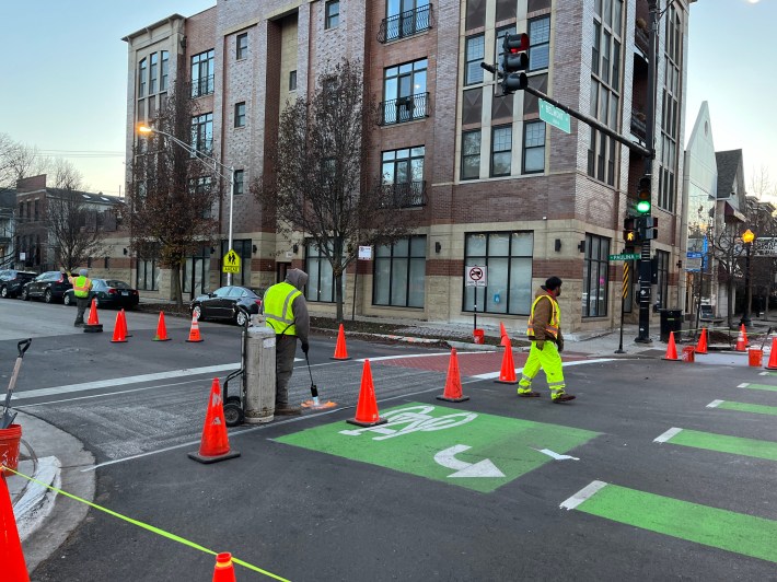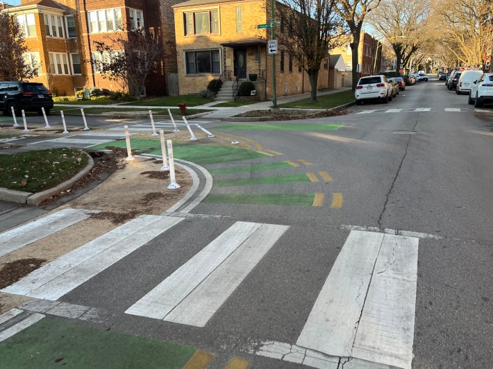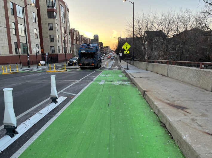 I was under the impression that bike lane construction season in Chicago had pretty much wrapped up for 2023. After all, we had snow a couple weeks ago, and it’s hard to lay down thermoplastic and concrete when it gets cold. But during my ramblings today on Day Four of Streetsblog Chicago’s Bike Lane Week, I was pleased to find that the Chicago Department of Transportation still has a few cards up its sleeves this year.