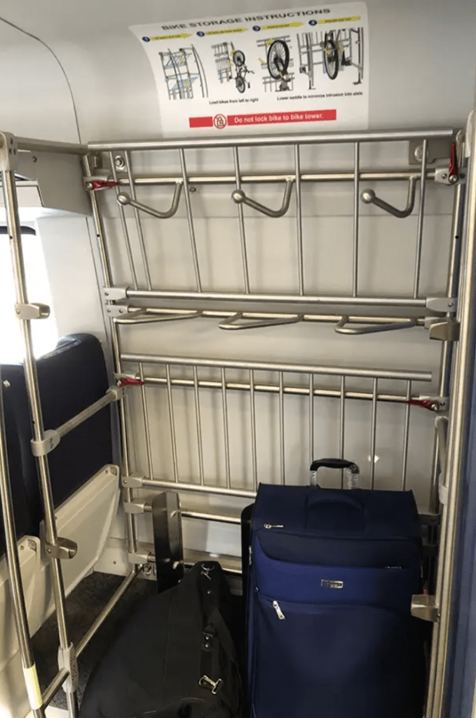 Magliari declined to specify exactly what other non-rack options there are for bike storage on the Hiawatha. “We have different options on different legacy trains.” In the past, conductors have often told passengers with bike tickets to lean their cycles against the wall of a passenger railcar in an unused wheelchair-friendly space at the front of the car.