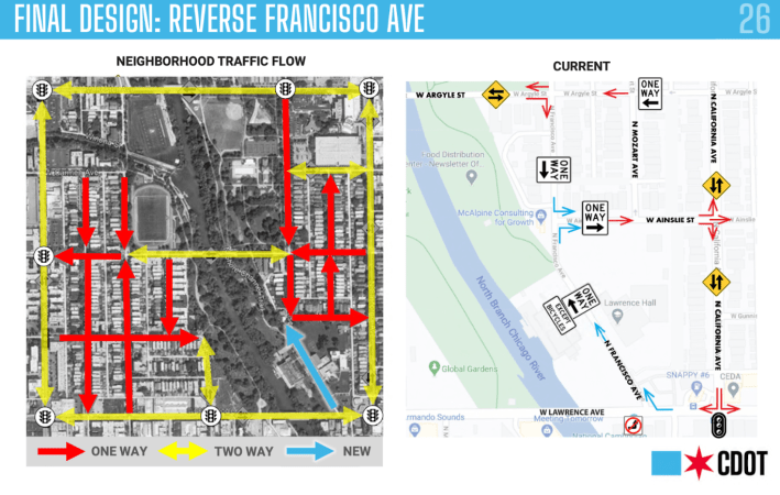 On the northwest corner of the project area is a one-block stretch of Francisco Avenue (2830 W.) between Lawrence and Ainslie Avenue (4900 N.) that is a frequently-used access point for pedestrians, bike riders, and other non-drivers going to River Park and the North Branch Trail. And while Francisco should be a quiet, residential street, it is also frequented by southbound drivers using it as a “cut-through route” to avoid congestion on nearby California Avenue (2800 W.) As part of the Lawrence Avenue project, CDOT is reversing this one-block section of Francisco to one-way northbound.