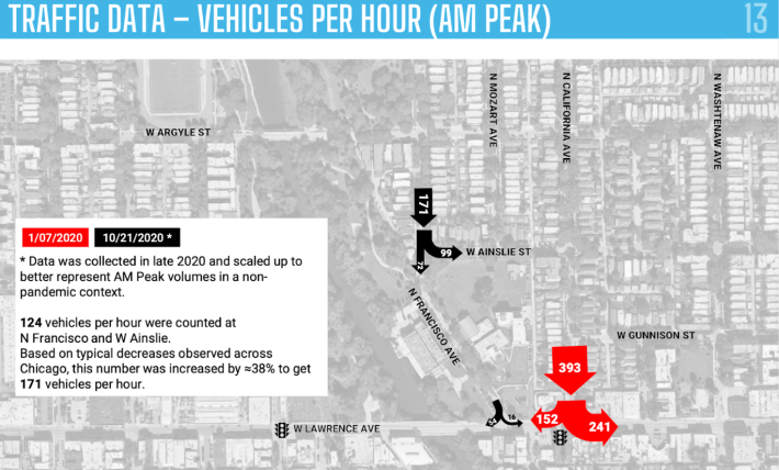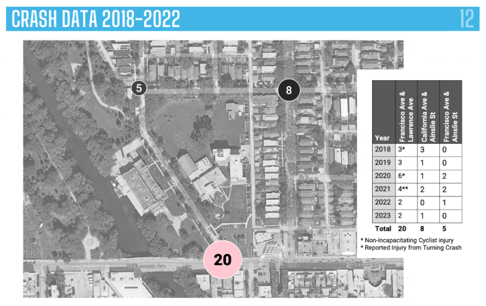 Poignant in the data presentation were traffic volumes and crash data. In the five-year traffic study period, 25 crashes were reported at either the intersections of Francisco and Ainslie or Francisco and Lawrence. Furthermore, an astounding 171 vehicles per hour were recorded traveling through the Francisco and Ainslie intersection during peak morning periods. At nearly three vehicles per minute, this corresponds to my previously reported direct observations of 51 motorists in 15 minutes during a recent afternoon rush period.