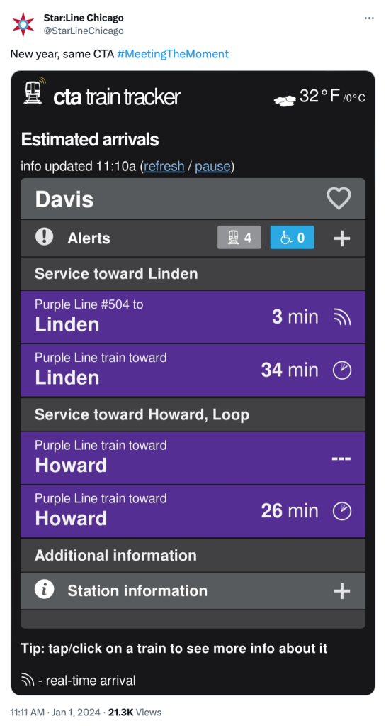 So, fingers crossed, the non-disgraceful CTA performance over the past couple of days is an encouraging sign. Hopefully in 2024 Chicago transit service will be getting a little better all the time.