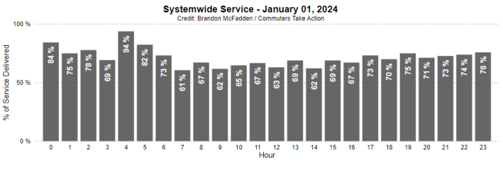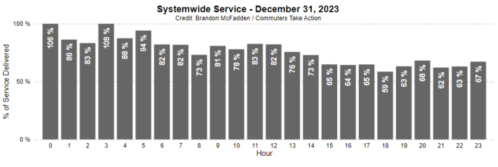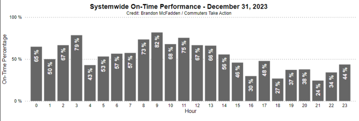 "For comparison sake, Washington DC's WMATA did 99 percent Service Delivery and 65 percent On-Time Performance (systemwide) on both New Years Eve and New Years Day using the same constraints," McFadden added.