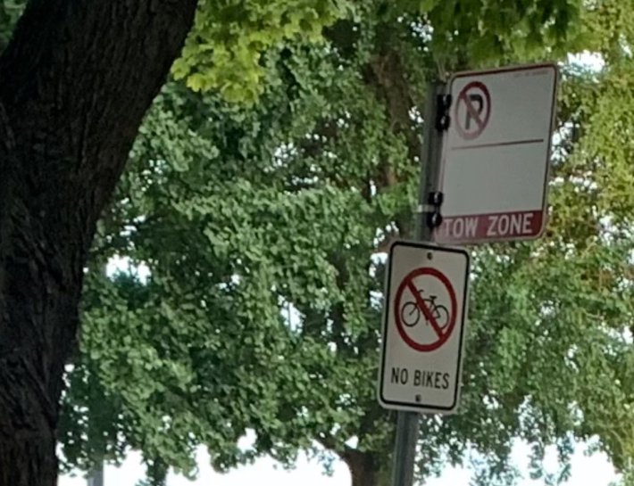 I immediate shared that explanation with CDOT's Schroeder. "The ["No Bikes"] signage in question is not a City of Chicago sign and is in the process of being taken down, if it hasn't been removed already," she confirmed.