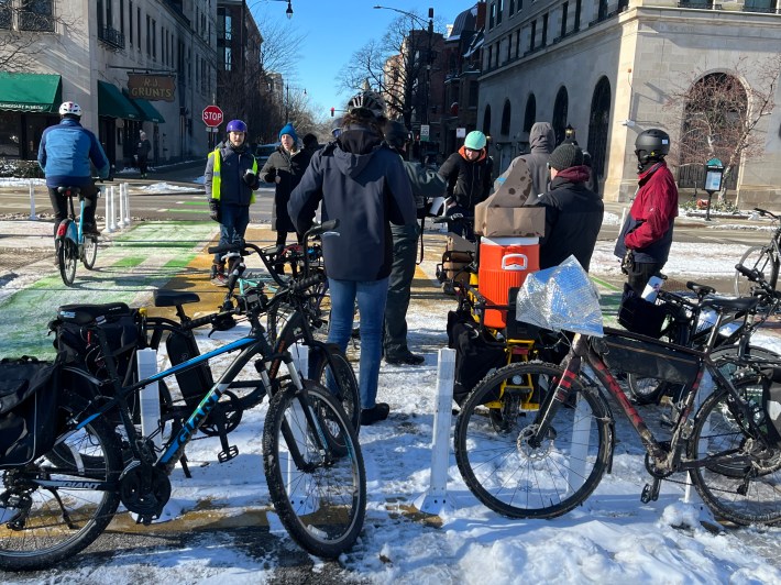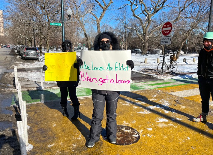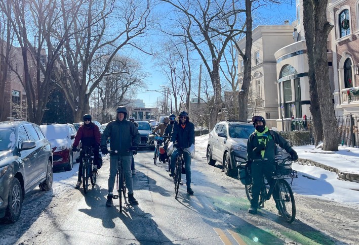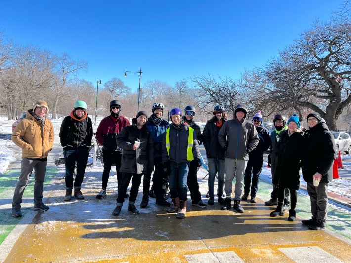 The ride gets started this morning on Magnolia Avenue north of Clybourn Avenue before heading east on Dickens. Photo is looking south.Left: Snow-filled eastbound contraflow (“wrong-way”) bike lane on Dickens east of Seminary, looking east today. Compare it to the well-plowed northbound raised bike lane on Clark Street near Irving Park Road in Lakeview/Uptown, looking north. Since many neighbors argue that the Dickens Greenway project is worthless, the city should help demonstrate that the greenway has value by keeping it in good shape for bike riders. Sure, it’s the dead of winter right now, but Clark shows it’s not that hard for the city to keep bikeways rideable. Moreover, a significant number of bike riders, including delivery cyclists and others head heading to workplaces, ride all year and will use well maintained bike routes.Riding east on Dickens east of Oz Park. While opponents have argued that having more people riding bikes on the avenue is dangerous, cycling routes with relatively little car traffic are safer and more appealing to families with young chlldren, like the kid in this trailer. The greenway project has also improved safety for other modes, thanks to a lower speed limit, speed bumps, sidewalk extensions, and raised crosswalks. Although Lincoln Park is one of Chicago’s very wealthiest neighborhoods, the cyclists were greeted at the traffic diverter plaza by these protesters holding signs denouncing “privileged bikers” and “elitist” bike lanes. Apparently, no irony was intended. And here’s an explanation on of why requiring bicycle licenses makes zero sense. Unfazed by the greenway haters, the riders enjoy churros and hot cider at the new traffic diverter plaza, looking west.Group shot of remaining ride participants in the plaza near the end of the hangout session (a few people, such as the parent and young child with the bike trailer, had left by then), 13 people plus the photographer, looking east.
