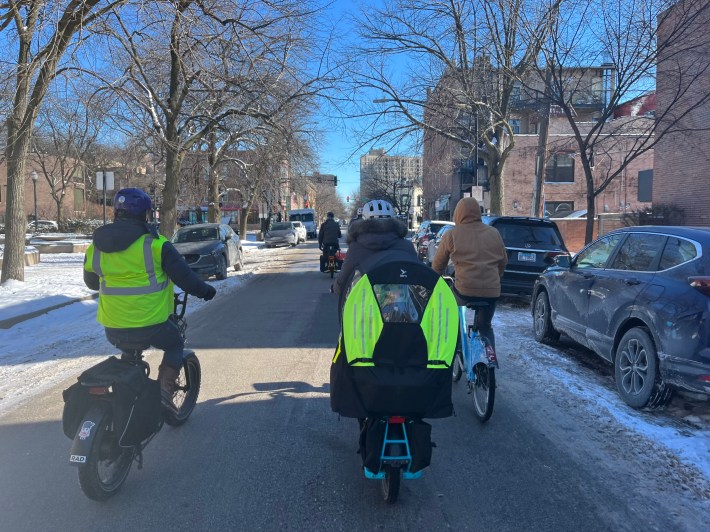 But I wanted to provide a quick “Eyes on the Street”-style gallery of today’s very fun Churros and Chill bike ride, which celebrated the completion of the low-stress bike-ped routes. The first half of the title of this post, “No one bikes in Chicago during the winter!,” is tongue-in-cheek, since around 20 people pedaled in the ride altogether.