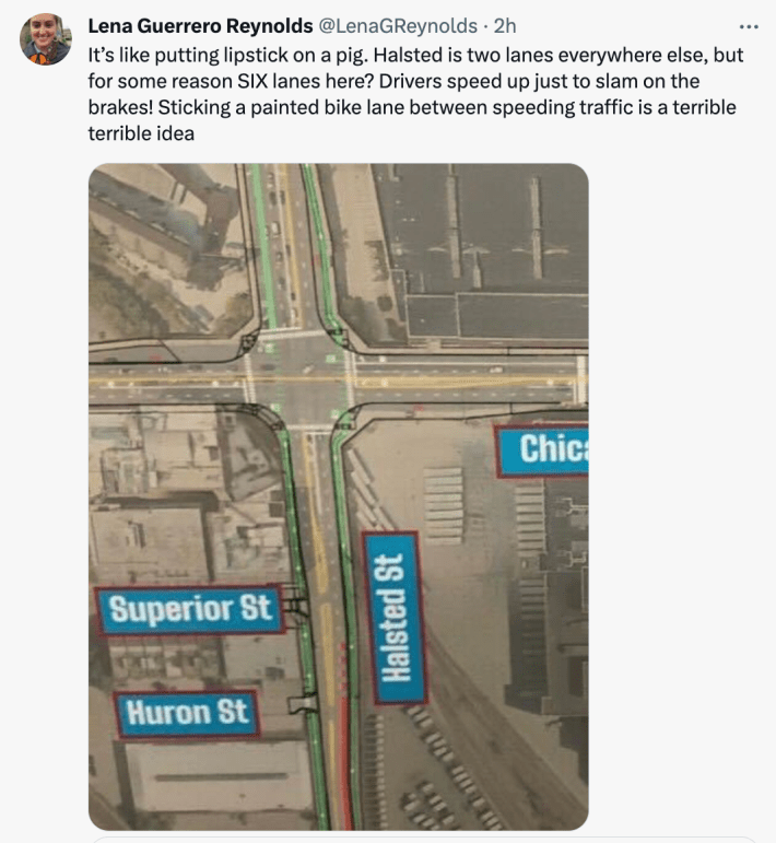 For Halsted, the plan calls for raised bike lanes on both sides of the street between Chicago Avenue and roughly where Ancona Street (630 N.) would be, while putting in a partial southbound bike lane and a northbound bike lane along the sidewalk north of the intersection. It also calls for putting in a northbound bus lane south of the intersection, roughly between Ancona and Huron streets. This would leave four lanes, two in each direction, available for drivers. The renderings suggest that the concrete median south of the intersection will be removed.