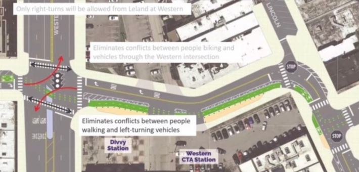 According to one of the boards at the open house “The project will foster community and economic growth, support opportunities for community gatherings and events, and provide protected bike facilities.” The latter refers to the long-awaited Leland Greenway bike route, approved by neighbors back in 2019, which will include a raised two-way bike lane on the south side of Leland between Western and Lincoln. The project “will also provide an enhanced pedestrian connection from the CTA Brown Line Station to Lincoln Avenue under the existing elevated tracks.”