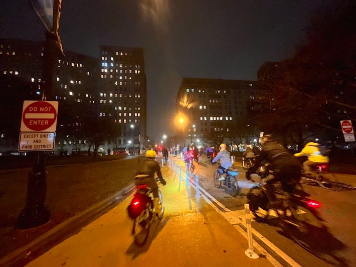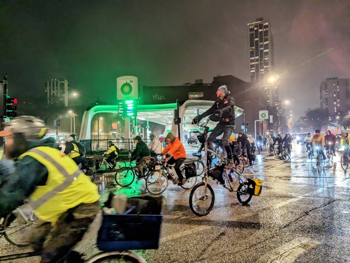 Maybe it was due to the revival of the Polka Ride ride, or perhaps because 39 degrees seemed downright balmy compared to the -9F temperatures Chicago experienced less than two weeks earlier. But there was a big turnout at Daley Plaza that Friday night in spite of the rain, which makes cold-weather biking especially challenging. In such conditions, good rain gear and/or fenders are key for a comfortable ride.