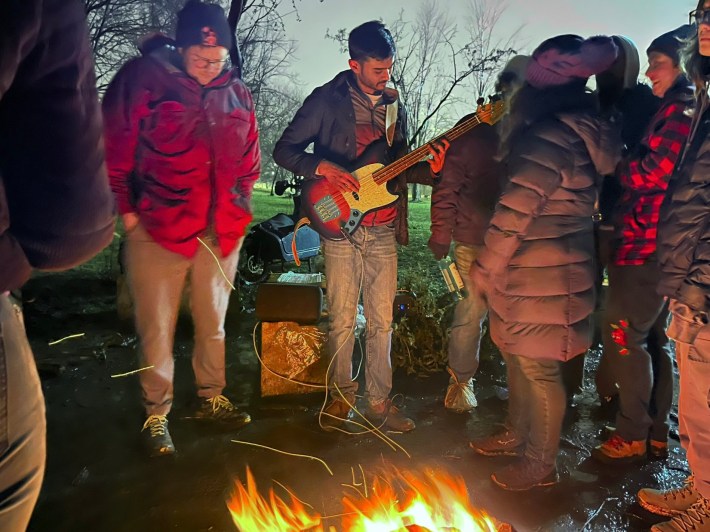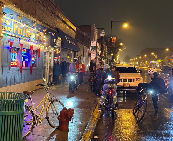 Since the date coincided with the January Critical Mass, a Polka Ride route map was proposed that stair-stepped about 10 miles northwest from Daley Plaza to the venue, visiting a few notable new safe streets installations along the way. In addition to stopping at the tavern, the plan included a riverfront bonfire at nearby Clark Park.