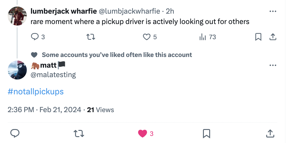 • Some transportation modes (like driving pickup trucks) have exponentially more potential to harm bystanders than others (like riding transit). But everybody has the ability to behave carelessly or considerately when traveling, regardless of what kind of vehicle they’re using.