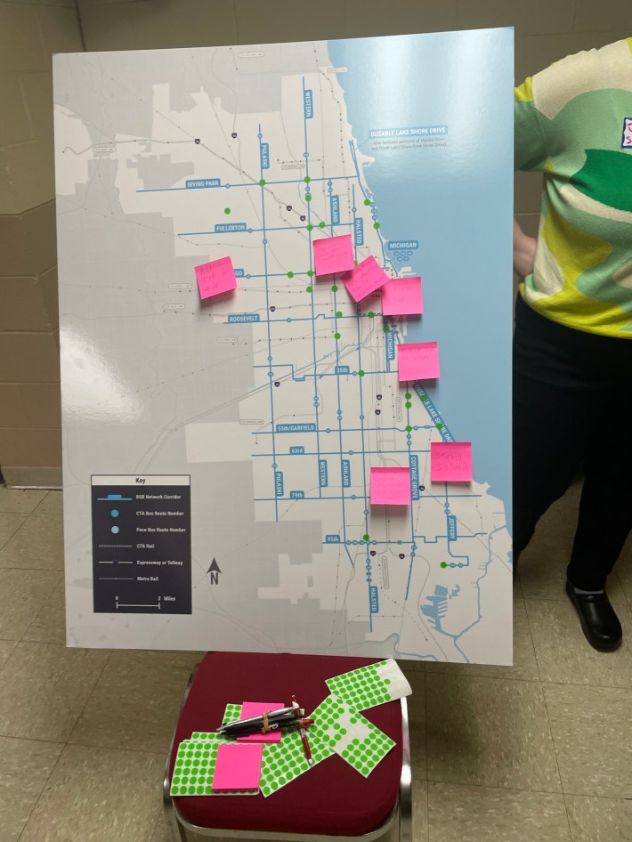 At the town hall there were multiple fliers about future transit-related events near the sign-in form. There was also a board with a map of Chicago on it, and people were asked to leave suggestions for public transportation improvements.