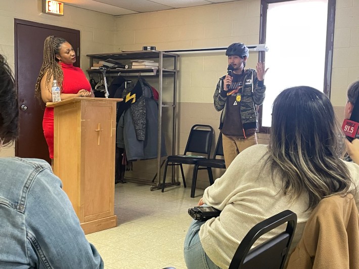 Another person who got up to speak was Vanjo Cortes, the workforce manager at Equiticity, a mobility justice nonprofit. While the event was focused on transit, he pointed out that he was wearing a helmet, since he biked to the town hall, and brought up some cycling issues: the need for more protected bike lanes and bike parking racks.