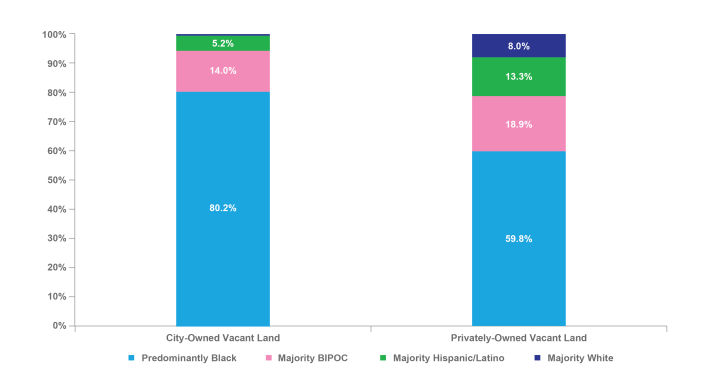 - Of the nearly 8,800 City-owned vacant lots in Chicago, more than 80 percent are in communities that are at least 80 percent Black, while less than one percent are in majority-white areas.