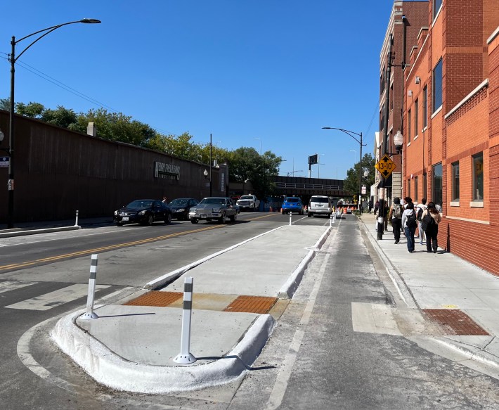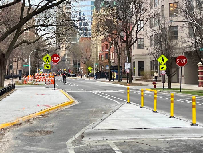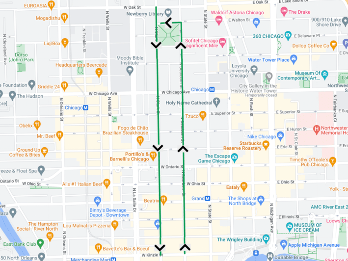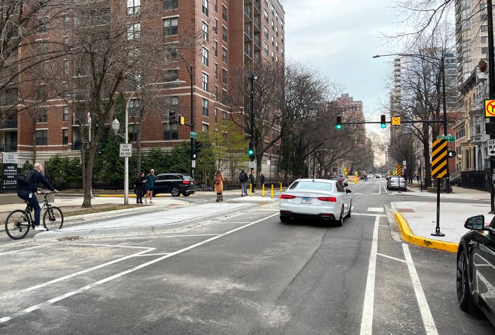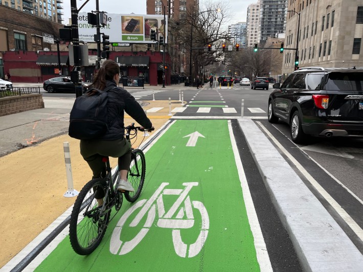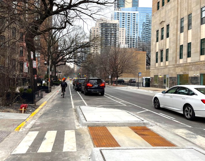 The new bikeway takes you 0.7 miles from Kinzie to Walton Street, where you can head west to meet up with Clark, which is two-way north of Walton, to continue into Lincoln Park. Just about every intersection on this stretch has sidewalk extensions or floating pedestrian islands, which make it much safer and easier to walk across Dearborn.
