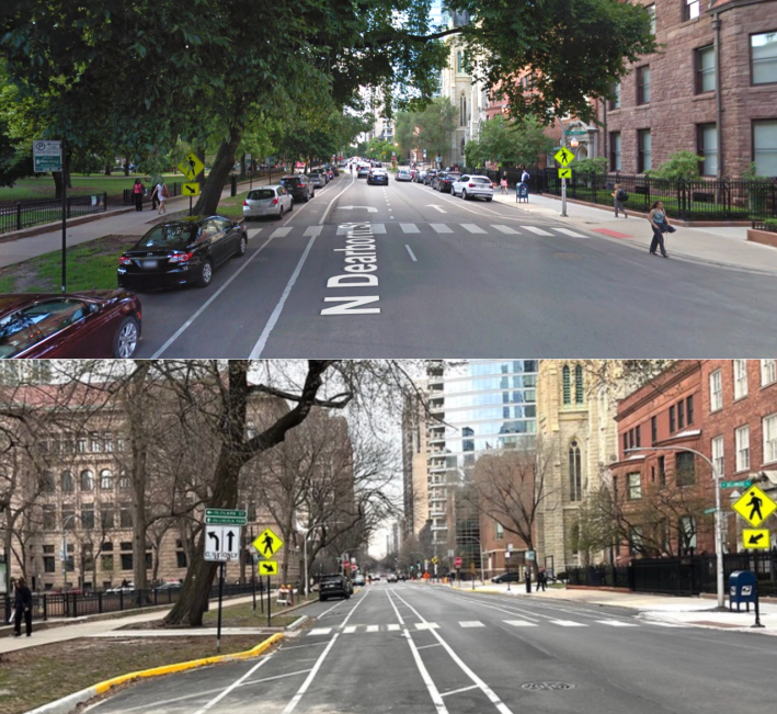 Tragically, pedestrian safety improvements were way overdue on this section of Dearborn. In May 2019, Lynda Havlin, 68, was walking her dog in a crosswalk at Delaware Place and Dearborn, by Washington Square Park, when a driver reportedly sped backwards and killed her. The motorist received two traffic tickets. Read more about the case and Havlin’s life here.