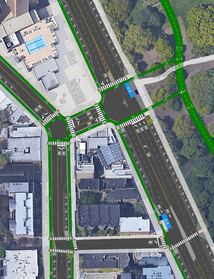 Gamarra proposed building a new off-street bike path through the Lincoln Park green space, parallel to Clark and connecting to the Lakefront Trail, plus Clark south of North Avenue, and Wells. He also called for upgrading the on-street bike lanes by making them curbside with parking and/or (prerably non-flexible) bollard protection, and protected intersections. Other features of his proposal included bus boarding bump-outs, curb extensions for shorter pedestrian crossings, and additional crosswalks.
