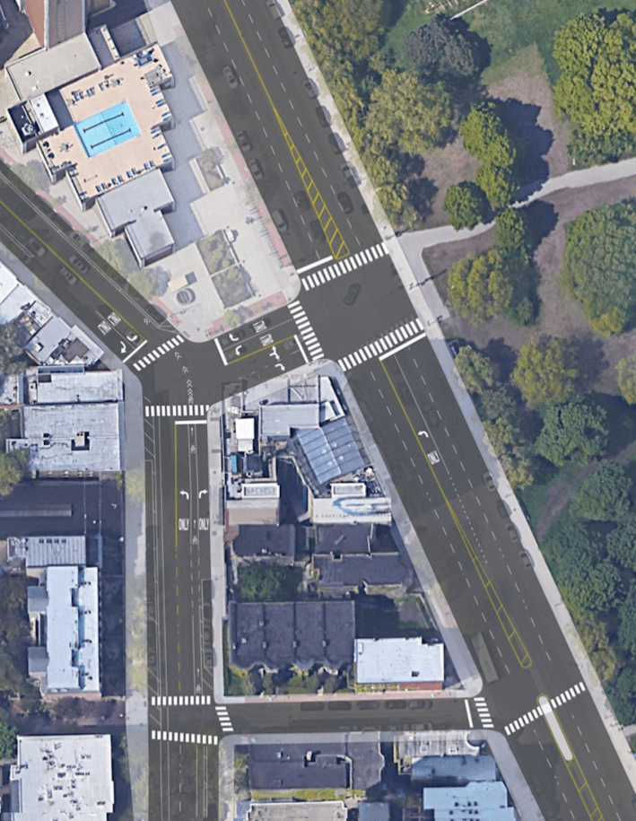 “This section of road between Armitage and North Blvd. creates a major gap in the network of safe bike lanes,” the software engineer noted. “Currently, bike lanes on Lincoln [Avenue] and Wells [Street] are narrow and unprotected and have mixing zones [locations where drivers cross the bikeway to turn right] and conflicts with parking spaces.” He added that there these streets have long crossings for people on foot, with no pedestrian islands.