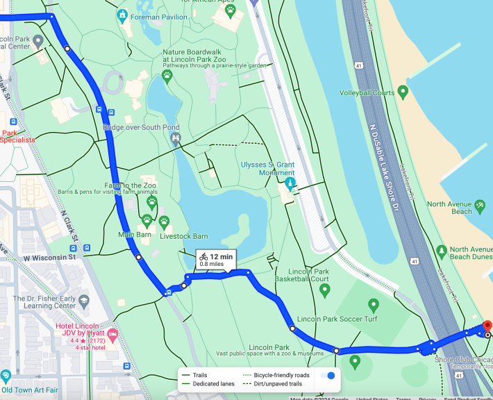 Now, here’s a route I currently might ride between the Dickens traffic diverter plaza and the Lakefront Trail towards the Loop, riding south on Stockton and then east on off-street paths to the North Avenue bike-pedestrian bridge. While it’s generally legal to cycle on Chicago park trails, Gamarra is correct that they are often narrow, and you must ride cautiously, at a slow-to-moderate speed, to avoid conflicts with people on foot. And obviously this is a non-intuitive route. So, yeah, a better Dickens-LFT option is needed for riders headed to or from downtown.