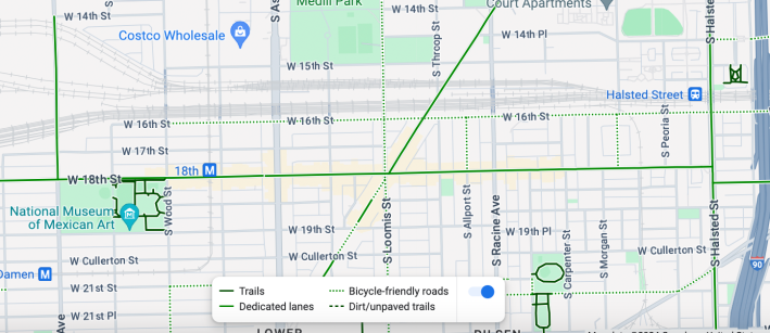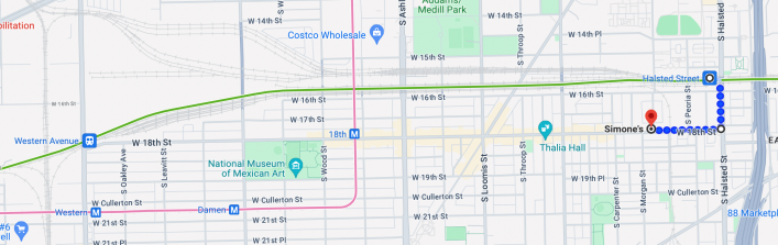 Update 3/22/24: Another option for traveling to and from Pilsen’s 18th Street by train, suggested by reader Dan Joseph (see comment below), is Metra’s BNSF line. If you’re visiting something on the east side of the corridor, like Simone’s Bar, 960 W. 18th St., the Halsted Street station would be a good option. If you’re going somewhere further west, like 5 Rabanitos Mexican restaurant, 1758 W. 18th St., or the National Museum of Mexican Art, 1892 W. 19th St., get off at the Western Avenue stop.