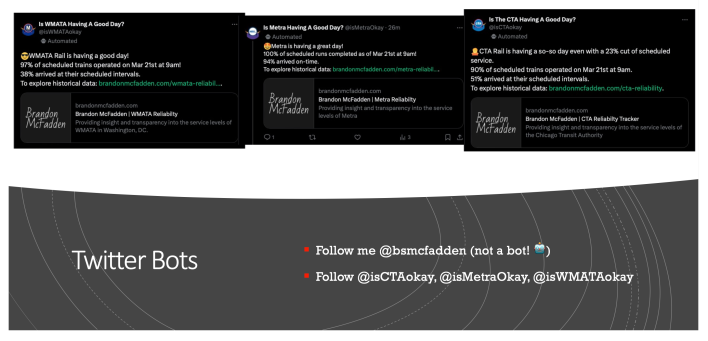 “Just collecting data isn’t that helpful though,” McFadden said during his presentation. “You can have all of the data in the world but if you don’t use it, then it’s useless. It’s just taking up space. So finding a way to make it easy to digest is even more important. One way to get that information out to the public is via Twitter bots. Each bot brings the same information in the easily digestible format. It tells you what agency, how much service, and the amount of service that was completed as what percentage it ran on time.”