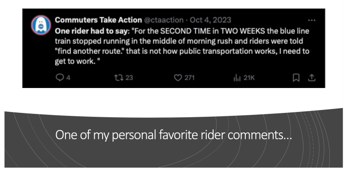 While McFadden works as cyber security analyst at American Airlines, he also serves on the board of directors for the Chicago chapter of Young Professionals in Transportation. Since June 2022, he’s been publishing the CTA Rail Reliability Tracker. Commuters Take Action (CTAction) uses that report for their daily tweets about the percentage of scheduled ‘L’ runs that actually materialized on each line the previous day.