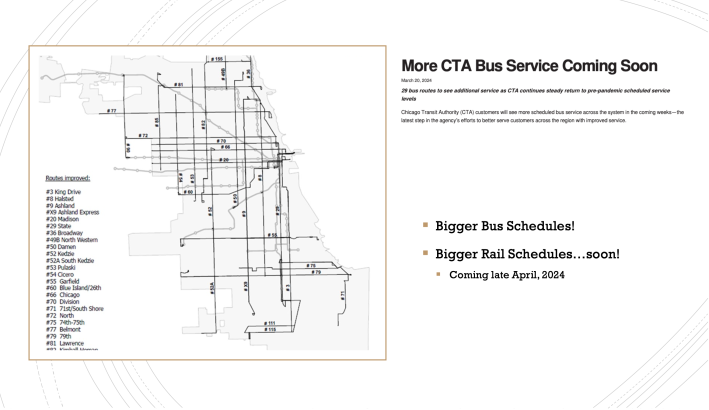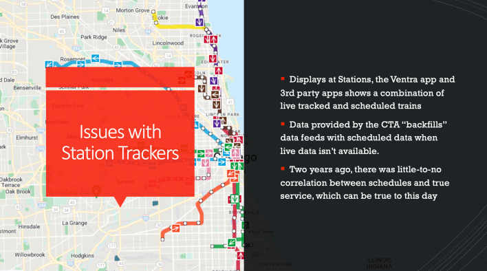 Next McFadden discussed complaints CTAction has heard from riders. The most important one, he said, was the lack of reliable train trackers in ‘L’ stations, which results in the dreaded “ghost train” phenomenon. “They would show a train is coming, but the train wouldn’t show up.” According to McFadden, the CTA still uses GTFS Static Schedules, which can’t be adjusted if there’s an issue, like a lack of employees to staff a run. Third-party tracking apps like Transit App and Google Maps fall back to scheduled service when real-time data is not available. In addition, buses and trains don’t provide tracking data if they’re not moving.