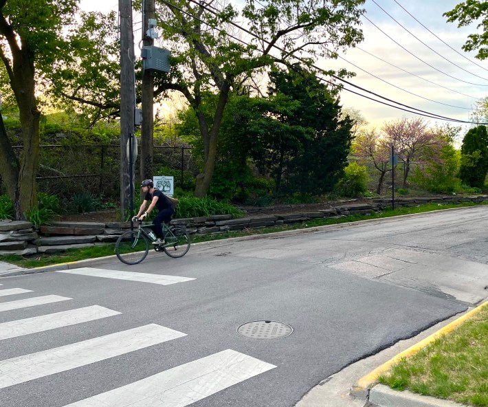 Winnemac is the borderline here between the 47th Ward and the 40th Ward, represented by Ald. Andre Vasquez, who also has a generally strong record on sustainable transportation issues. His Director of Communications and Development Alison Murphy said there will be speed humps and other traffic calming measures, like sidewalk bumpouts to shorten crossing distances, between Winnemac and Peterson.