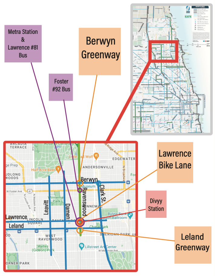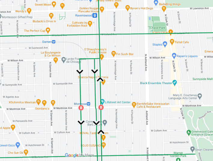 “You can then head west on Wilson to the west leg of Ravenswood (the one with the pavers – but we are actually having that one resurfaced since the pavers are in poor shape, especially for biking.) Or you can ride a little further west to Wolcott Avenue [1830 W.], which brings you south, with a traffic light at Montrose Avenue [4400 N.], to the Berteau Neighborhood Greenway [4200 N.]”