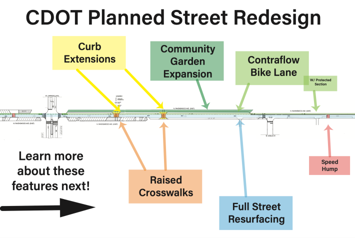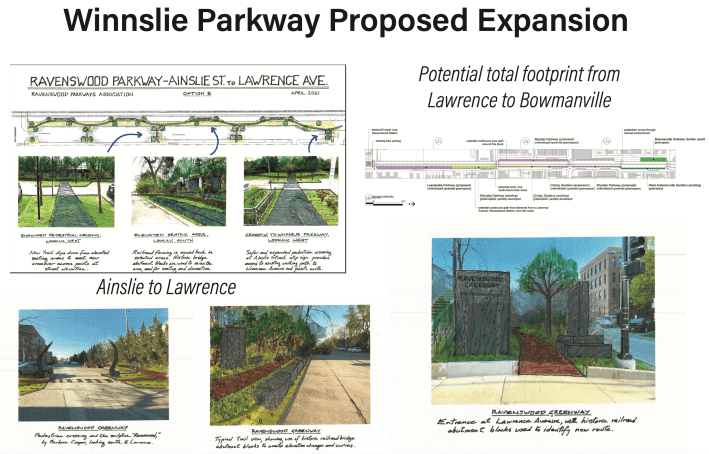 “We are also going to be extending the existing Winnslie Parkway community garden along the tracks from Ainslie down to Lawrence by converting diagonal parking [on the west side of Ravenswood] to parallel parking to create space,” Mark added. “All of this comes with several raised crosswalks and speed humps for traffic calming.”