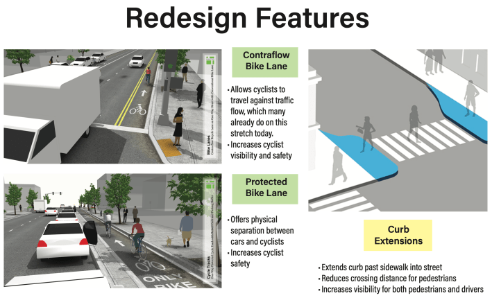 Mark said City parking counts found those spaces were getting relatively little use – more on that in a bit. So, in addition to shielding cyclists from reckless drivers, one reason for the concrete protection is to help keep motorists from parking in the bike lane.