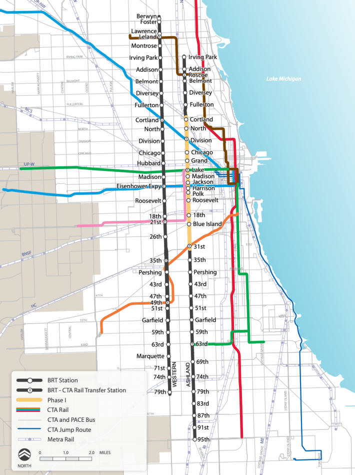 JG: Let me ask the obvious question. When the City of Chicago tried to do BRT on Ashland Avenue, something very similar to what you’re proposing – they actually floated the idea of both Ashland and/or Western and then settled on Ashland – they faced a really stiff blowback. The “Not In My Back Yard” types were opposed to having fewer mixed-traffic lanes to make room for center-running bus lanes and stations; banning left turns from Ashland in some locations; and removing a small percentage of car parking spaces.