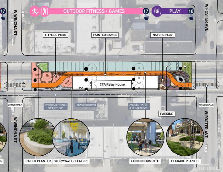 The plan calls for a skate park north of Foster, fitness pads north of Winona Street (5130 N.) and a “sports court” a little south of Ainslie Street (4900 N.) Emily Ryan, a CTA construction project manager, said that they would be used for “ground sports,” since the court can’t have a fence people can climb onto. She did not elaborate on what that meant, except to say that soccer wasn’t one of them.