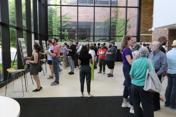 The CTA officials present emphasized that the plans unveiled at the May meetings are preliminary. Residents were invited to add suggestions via Post-it notes and share feedback directly with project representatives. There were also billboards where residents could use circle stickers to indicate what kind of features they would like to see. About two-thirds of the way through the meeting, the skate park got a significant number of votes, and so did adding murals, having prominent wayfinding signage, and using environmentally friendly materials.