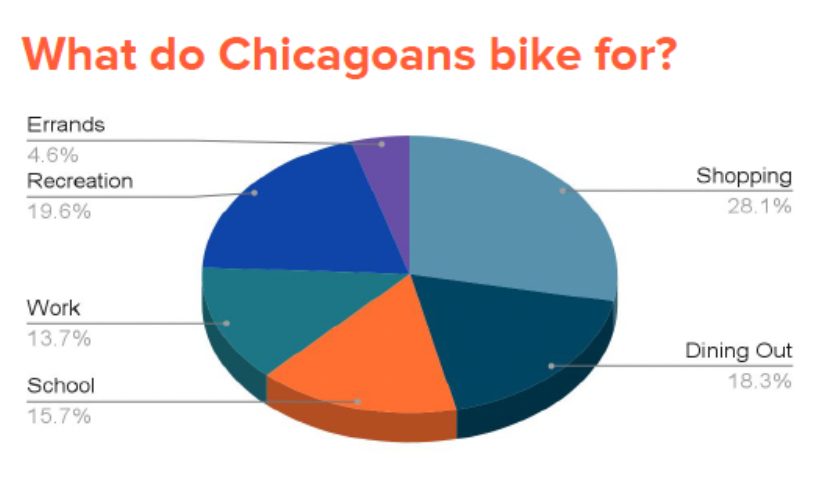 The report, issued last week by the Chicago Department of Transportation and data analytics firm Replica, states that bicycling in Chicago grew a whopping 119 percent in the last four years. That’s the largest increase among the ten largest U.S. cities. According to the study, Chicagoans are increasingly taking bicycles crosstown – on trips that span four or more neighborhoods – and within their own neighborhoods to go shopping, dine out, recreate, and travel to school and work. Bike journeys to workplaces saw a modest increase, just 8 percent. But cycling to a restaurant grew by a full 93 percent, and the number of shopping trips by bike ballooned by 117 percent.