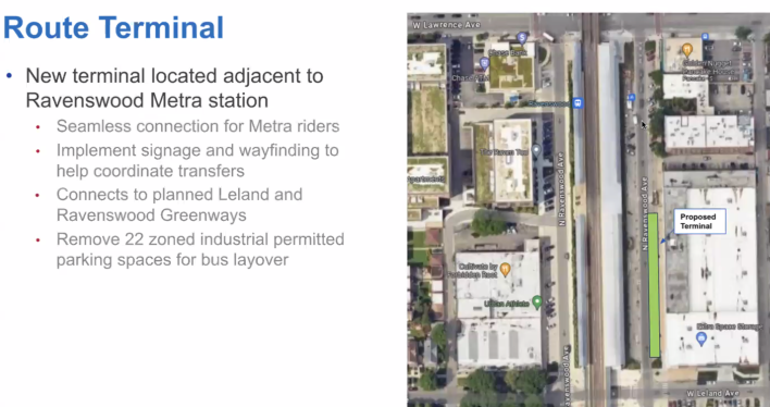 After that, Czerwinski discussed the new route terminal location on the east side of Ravenswood, between Lawrence and Leland (4700 N.) avenues. He noted that, in addition to rock star-level Metra access, this location will be served by the upcoming Leland and Ravenswood “neighborhood greenway” side street bicycle routes. He noted that 22 zoned industrial car spaces will be converted for the terminal, “but it will open up a lot of opportunities for this area.”