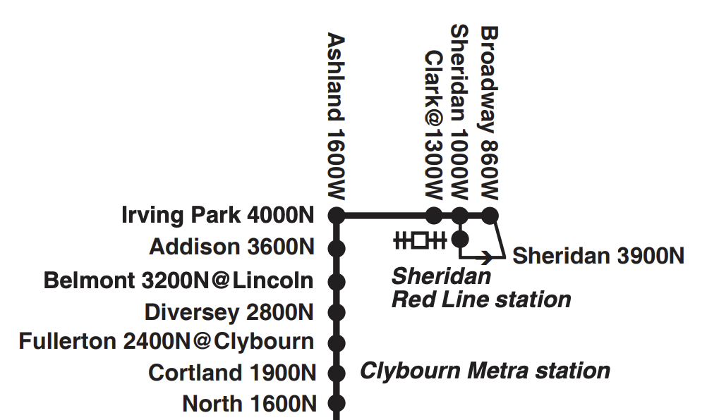 Currently northbound 9 Ashland buses head east from Ashland on Irving Park to Clark Street (about 1330 W. here), then head northwest a block to the northern terminus of the route at Belle Plaine Avenue (4100 N.). The new 9 Ashland route would instead continue north on Ashland to connect with the recently rehabbed Ravenswood Metra station at Lawrence Avenue (4800 N.), creating many new commuting options.