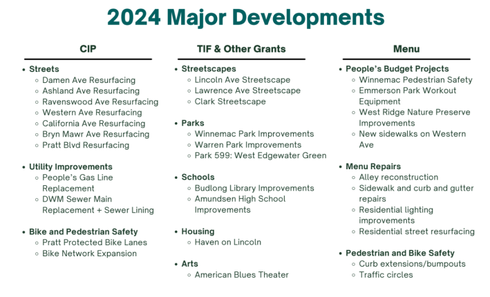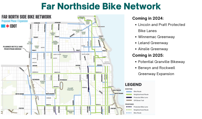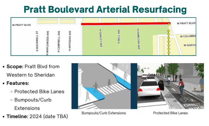 - Protected bike lines on Lincoln between Western and Berwyn, and Pratt between Western and Ridge