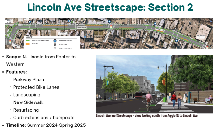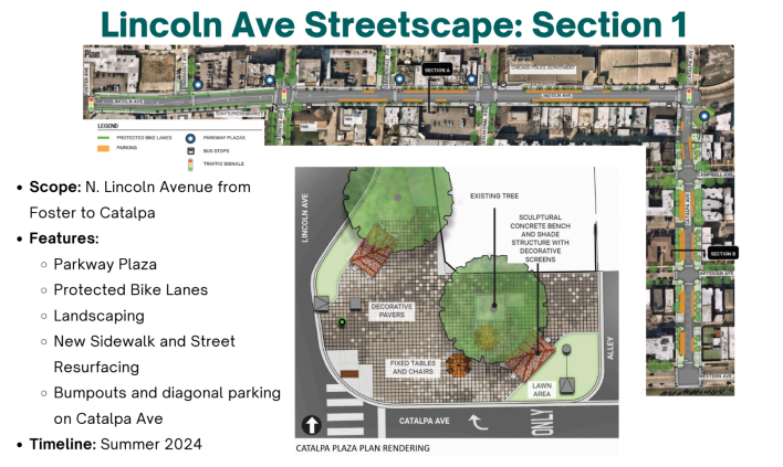 The 40th Ward staff also discussed a few upcoming Streetscape projects on Lincoln Avenue, Lawrence Avenue (4800 N.), and Elise Malary Plaza on Catalpa Avenue (5500 N.) between Clark Street (about 1530 W. here) and Ashland. See details about these projects below.