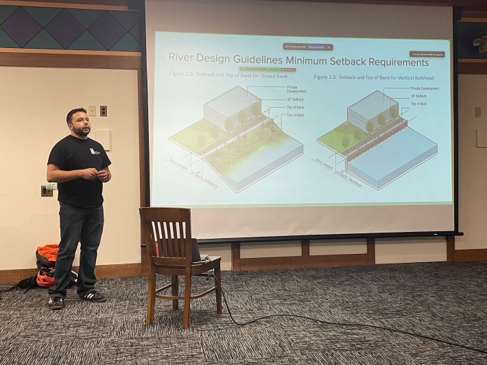 “In 2019 the City updated the Chicago River Design Guidelines,” explained Eladio Montenegro, project manager with the McKinley Park Development Council, at the start of the presentation. “And those require that anyone who buys land along the river, and develops it, has to create a public walking path. So it’s very specific. You have to do a 30-foot setback from the edge of the river, create a ten-foot trail with gravel on the side, specific plants and trees, specific seedings, specific lighting, and that kind of stuff has to happen. And so that’ll take care of some big chunks of our project.”