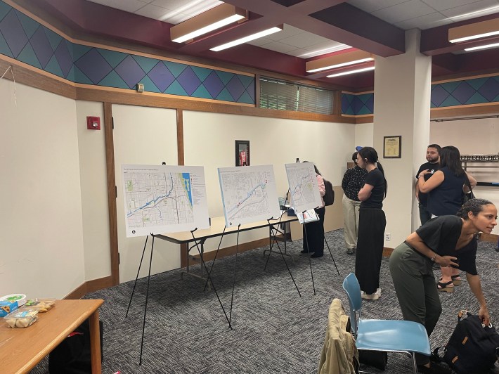 Last week the McKinley Park Development Council gave an overview of its new riverfront redesign proposal, The South Branch Connectivity Project: Framework Plan, to residents at the neighborhood’s local library. Over the past year, upwards of 600 neighbors have provided feedback for this plan to link the riverside parks, create more green space, and to provide more transportation and recreation options along the waterway. The purpose of the meeting was to give a preview of how a continuous riverwalk might look, and what it would take to achieve that vision.