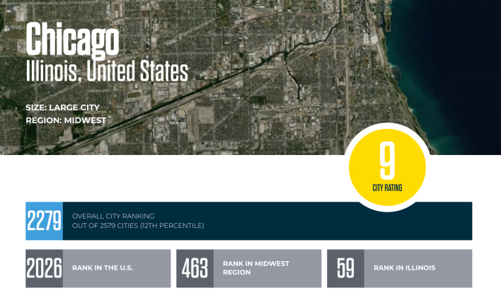 There’s no obvious answer on the City Ratings website. But today PFB staff confirmed my suspicions that Chicago’s massive 2020 ratings drop was all about the speed limits. “You are correct,” City Ratings Programs Director Rebecca Davies told me. “We introduced customized speed limits in 2020, at which point cities with default residential speed limits 30 mph or higher saw their scores decline. Previously we assumed 25 mph default speed limits on residential roads in all cities.”